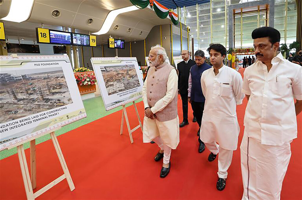 Chennai: Prime Minister Narendra Modi with Tamil Nadu Governor R.N. Ravi, Union Minister for Civil Aviation Jyotiraditya Scindia and Tamil Nadu Chief Minister M.K. Stalin during the inauguration of the New Integrated Terminal Building of Chennai Airport, Saturday, April 8, 2023. (PTI Photo)