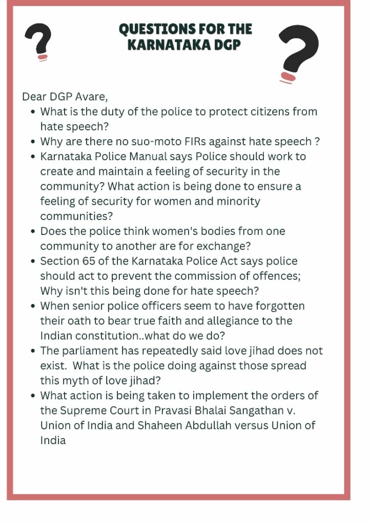 “Who is stopping @DgpKarnataka police to comply with SC Guidelines?” – Placards were displayed reminding the senior Karnataka police officer of Supreme Court’s guidelines on hate speech which states that police can take suo motu action against those who incite hate through their speeches.